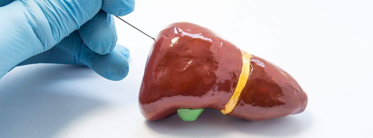 Extracción de una muestra de tejido hepático para análisis, realizada con técnicas laparoscópicas para diagnóstico.