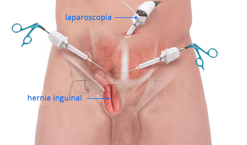 Reparación de una hernia inguinal mediante el refuerzo de la pared abdominal con malla a través de laparoscopia.